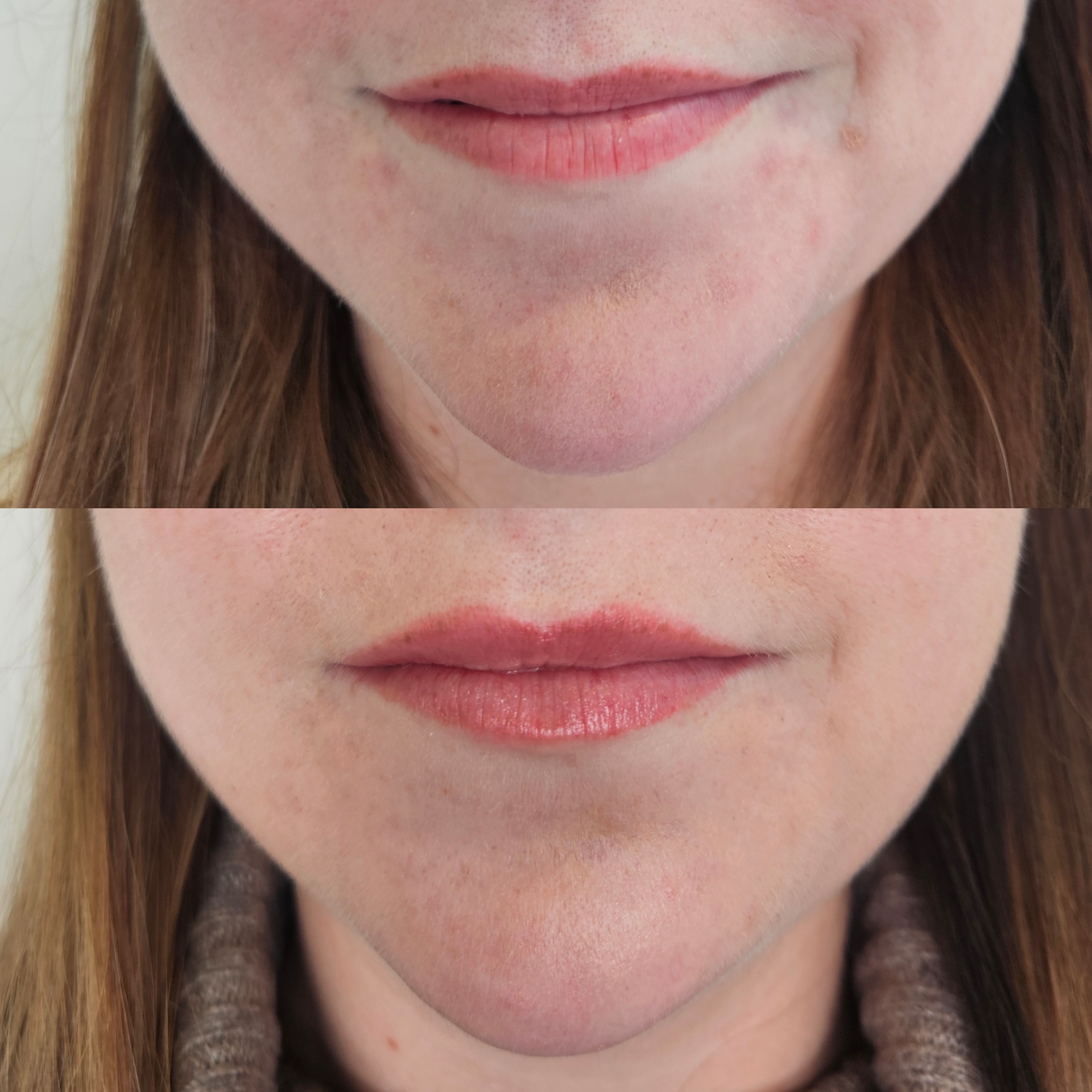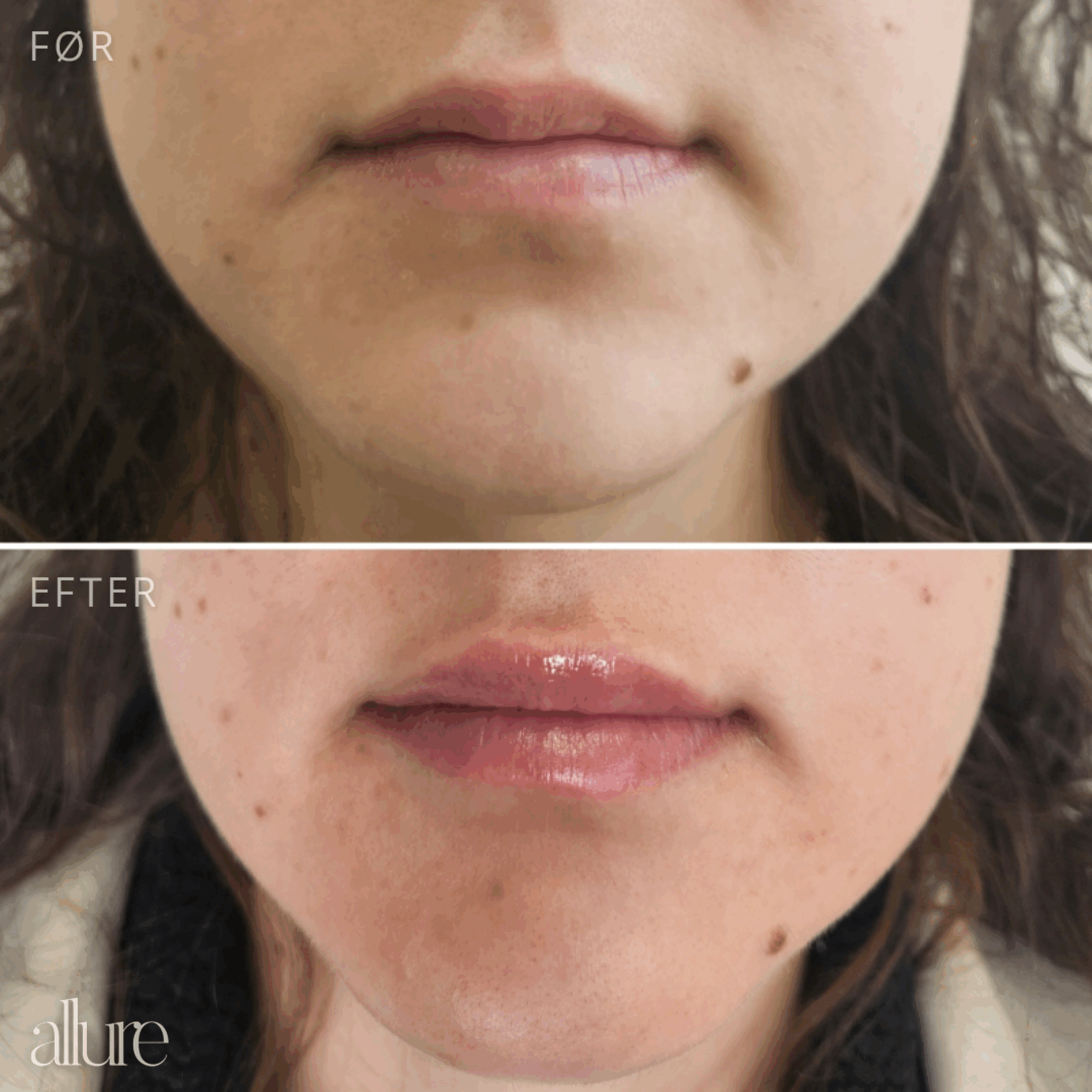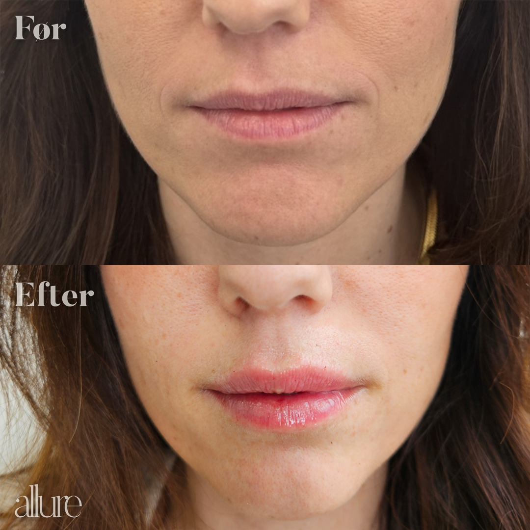 Læbebehandling med filler. Der er kun behandlet læbekanten.